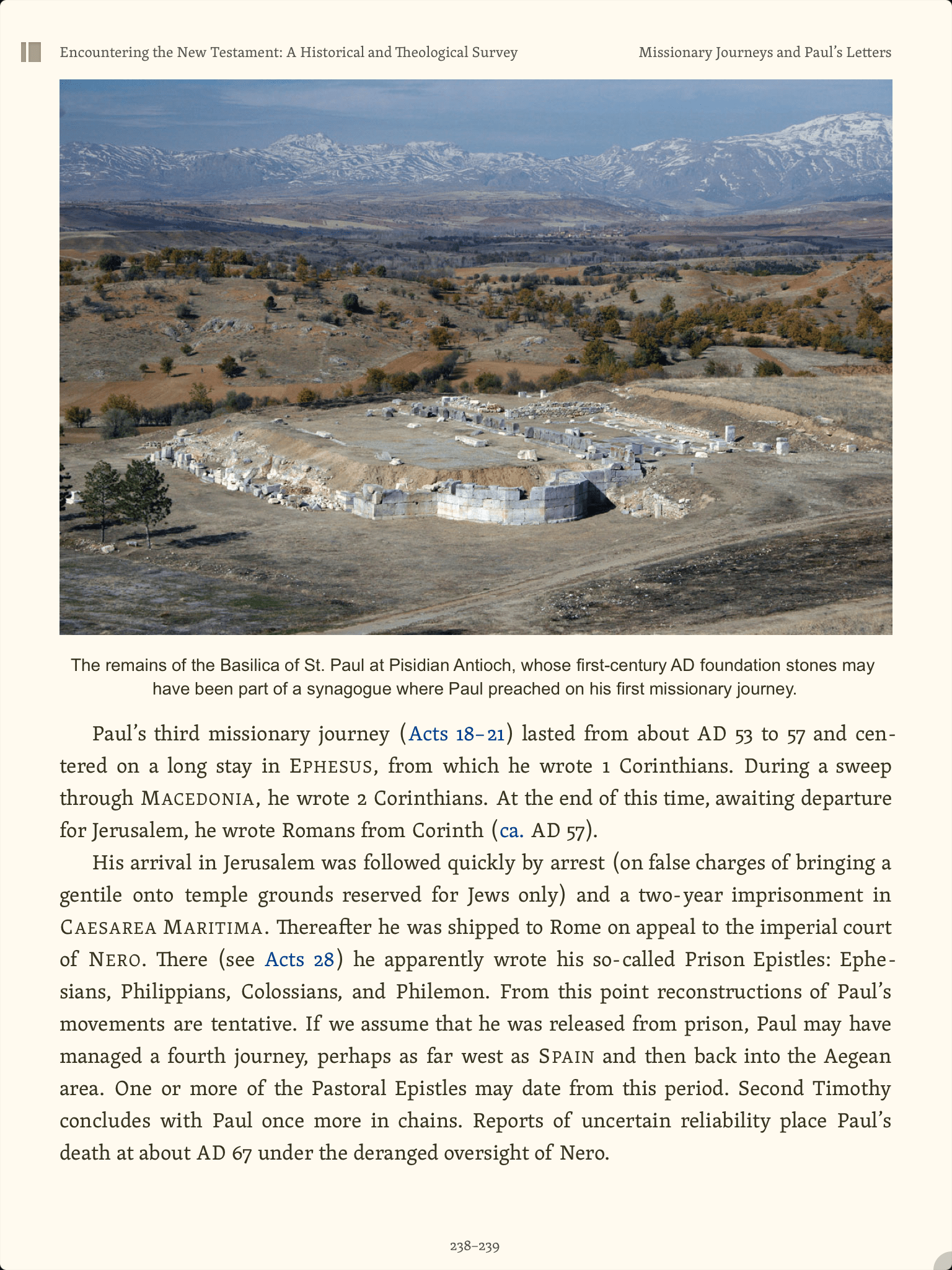 On the desktop version of Logos, the reader can read footnotes and scripture in floating boxes. Clicking on scripture will open the text in your favorite Bible. Logos has a timeline feature. When a date is given in the text of either book, the user can click the timeline flag to open the Logos Timeline. Photographs in ENT can be sent to PowerPoint or copied and pasted into any program. Words marked in bold in the print version indicate the word appears in the glossary. Moving the mouse over the bold/blue text floats the glossary entry.